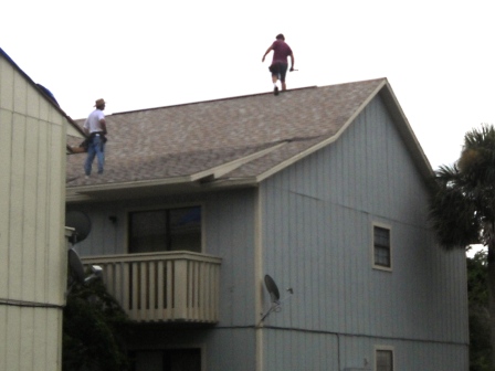 Pete Johnson of New Smyrna Beach looks at blown  insulation covering the outside of his home like snow, with pieces of the roofing twisted on his side balcony, following a small tornado that touched down on the beachside just after 1:30 p.m. Saturday  A tarp was placed on Johnson's Sandpiper Avenue home a short time later. Below, roofers begin repairs about two hours after the tornado touched down.