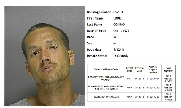 In addition to giving a false name and armed robbery with a handgun, Conrad was also charge with possession of cocaine. He was being held at the Volusia County Branch Jail in Daytona Beach.