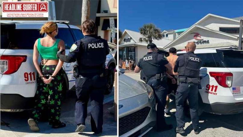 Photos for Headline Surfer / ABOVE: Two examples of the myriad arrests handled by New Smyrna Beach during the 2025 Spring Break within the city limits, including the beach. LEFT & BELOW: A handgun and some drug paraphernalia among items seized in motor vehicle stops on Flagler Avenue and on the beach itself in New Smyrna Beach, Florida, during Spring Break.