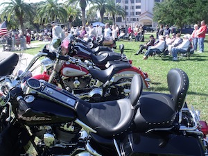 NSBNews.net photos by Henry Frederick / Retired Col. Irving Davidoff, shown at left, is the keynote speaker at Friday morning's Veterans Day service at Riverside Park in New Smyrna Beach. Lauren Lamb, 10, of New Smyrna Beach, is representative of the young and old alike paying tribute to America's heroes. And what would Veterans Day be without a line of Harley-Davidson motorcycles?