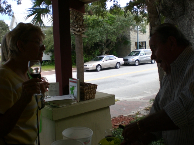 At left, Nicole Garni of the Galleria Di Vetro, Glass Gallery & Studio, 310 Flagler Ave., mingles with wine tasters in front of her boutiigue, which provided custom glasses for Saturday's wine-tasting festival on Flagler Avenue. In the middle photo, Alan and Bobbie Argue of New Smyrna Beach, and a third patron, taste wine at the same location. In the third photo, cooking school author Ed Pankonin of New Smyrna Beach, pours wine and answers questions about choice wines. Garni said close to 1,000 bottles were sold at various Flagler Avenue businesses Saturday afternoon during the wine-tasting festival.