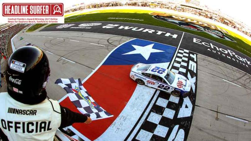 TOP: Credit: FORT WORTH, TEXAS - MAY 04: Joey Logano, driver of the #22 AAA Insurance Ford, takes the checkered flag to win the NASCAR Cup Series Würth 400 at Texas Motor Speedway on May 04, 2025, in Fort Worth, Texas. (Photo by James Gilbert/Getty Images).