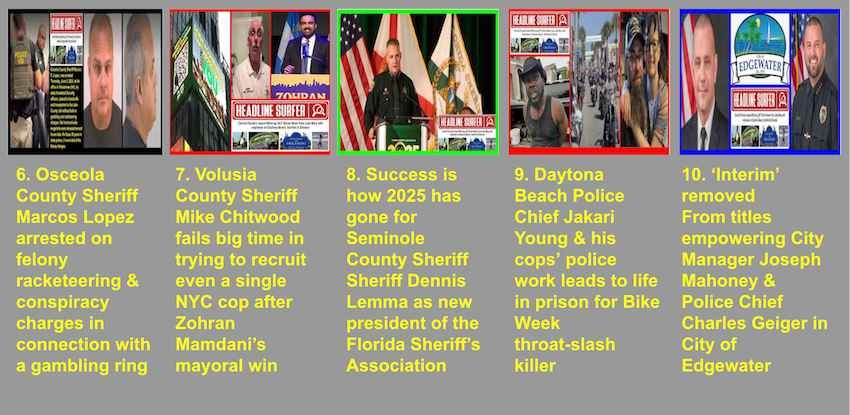 ORLANDO, Fla. -- For better or for worse, these were the Top 100 stories in 2025 in Central Florida in The Year That Was. This segment: Nos. 6-10. Here, it's all about top cops - Osceola Sheriff Marcos Lopez getting arrested, Volusia Sheriff failing in recruitment hires while trying to show up NYC's new mayor, Seminole County Sheriff Dennis Lemma showing real leadership, and upgrades in Edgewater titles.