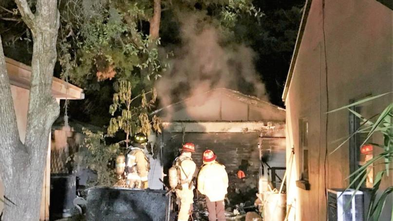 "Engine 50 quickly made a search of the residence and evacuated two occupants," New Smyrna Beach Fire Department Lt. Mike Greene told Headline Surfer. "Heavy fire conditions from the detached garage was impinging onto the rear of the residential structure. Engine 50 pulled a pre-connect fire hose and was able to have the fire under control in four minutes. Crews on scene effectively stopped the fire from entering the residential structure."