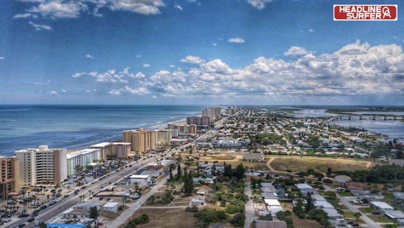 Photo by Stevo Biebs for Headline Surfer / ABOVE: Recent scene-setter shot of Daytona Beach, Florida captured with a drone camera. LEFT: Screenshot of New Smyrna Beach cam from Flagler Avenue just after noon on Monday, Oct. 24, 2022, in New Smyrna Beach, Florida.