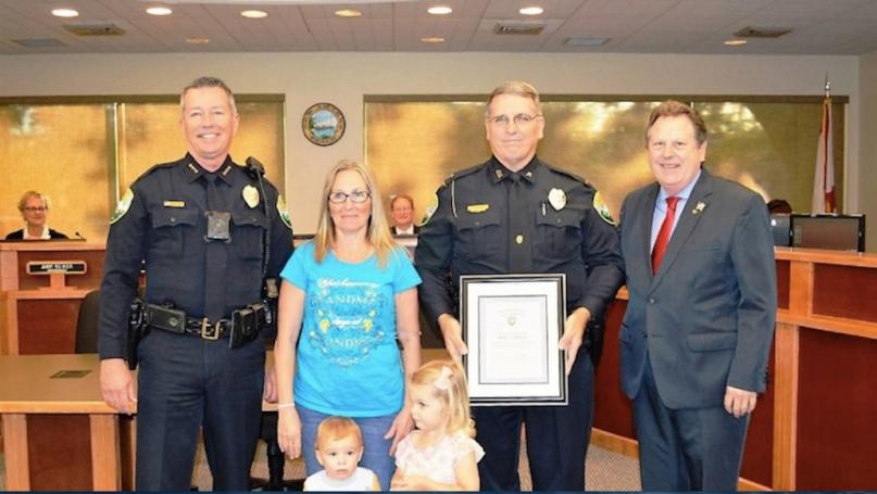 Photo for Headline Surfer / New Smyrna Beach Police Chief Mike Coffin and Mayor Jim Hathaway serve as bookends for newly-promoted Police Lt . Mark Severance, shown with his wife, Denise Severance, and their grandchildren, David and Georgia Severance at Tuesday's City Commission meeting. Looking on from the dais are City Commissioners Judy Reiker and Jason McGuirk.