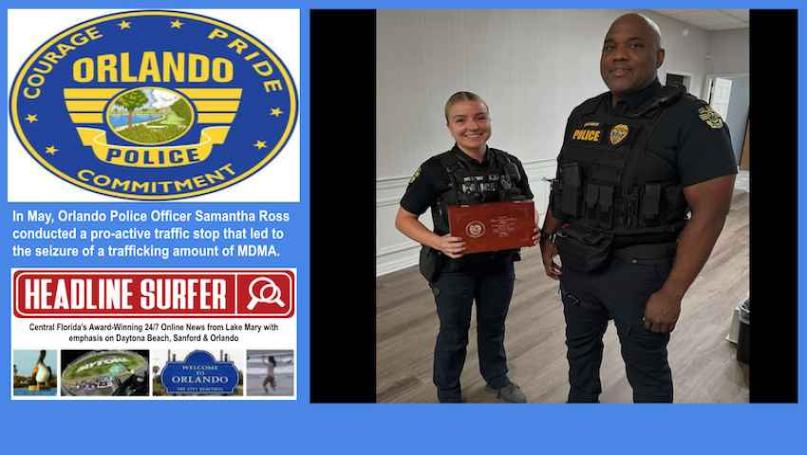 Photo for Headline Surfer / Orlando Police Officer Samantha Ross is shown with her boss, Orlando Police Chief Eric Smith, who recognized her as the Orlando Police Department's Patrol Officer of the Month for May.