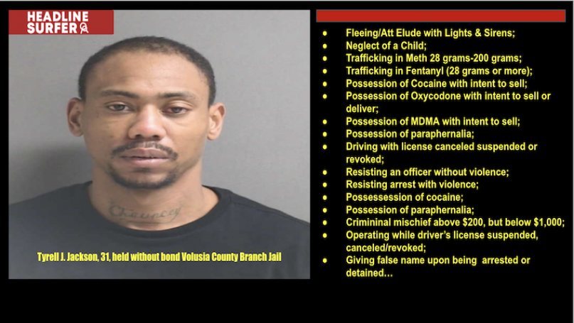 Jackson was charged with trafficking in fentanyl, trafficking in methamphetamine, possession of cocaine, Oxycodone, and MDMA with intent to sell, possession of narcotic paraphernalia, fleeing or attempting to elude law enforcement, child neglect, and driving with a suspended license.